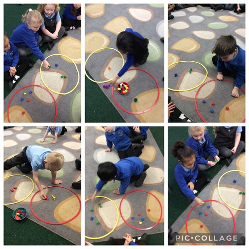 This week in maths, EYFS have been learning to sort and group according to criteria such as colour, size, shape.