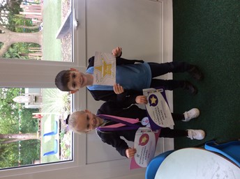 Two children in the class brough in certificates and medals from the gymnastics club they attend outside of school. They spoke confidently and clearly to the rest of the class about their achievements.